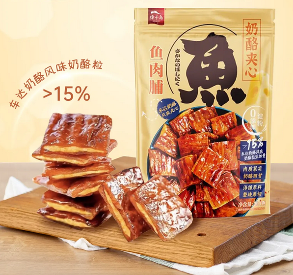 精選素有“海底鵝肝”美譽(yù)的安康魚,堅(jiān)持整塊原切 每一片魚肉脯都完整保留了安康魚緊實(shí)的肉質(zhì),入口鮮美 而其中超過15%的車達(dá)奶酪風(fēng)味奶酪粒更是點(diǎn)睛之筆 獨(dú)特的發(fā)酵工藝和豐富的乳脂含量,讓奶酪香氣與魚肉融合,濃郁而醇厚