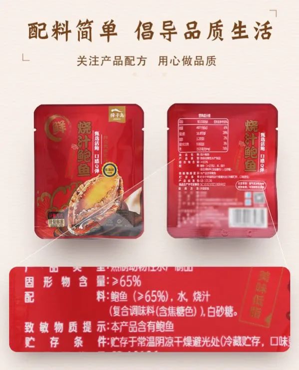 燒汁鮑魚(yú)采用獨(dú)立小包裝,更符合現(xiàn)代人的飲食習(xí)慣,口袋里的小零食,揣兜里隨時(shí)開(kāi)吃。