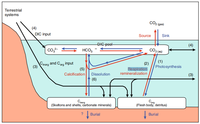 圖1 空氣-水-CO2交互的碳生物地球化學過程概念圖。藍線表示大氣CO2吸收的過程,紅線表示CO2排放到大氣中的過程。地表水中的CO2濃度主要決定通量的方向。地表水CO2濃度由溶解無機碳(DIC)中的碳酸鹽平衡決定,并受生態(tài)系統(tǒng)凈生產(chǎn)(光合作用、呼吸和再礦化的平衡)影響,直接調(diào)節(jié)DIC、外來顆粒物和溶解有機碳(Corg)、顆粒無機碳(Cinorg)以及來自陸地系統(tǒng)和沿海海洋的DIC輸入、凈Cinorg生產(chǎn)(鈣化和溶解的平衡),直接調(diào)節(jié) DIC 和總堿度(TA)和溫度(CO2溶解度)。鈣化作用產(chǎn)生的 CO2在正常海水中的比例(釋放的CO2/沉淀的 Cinorg)約為 0.6 。