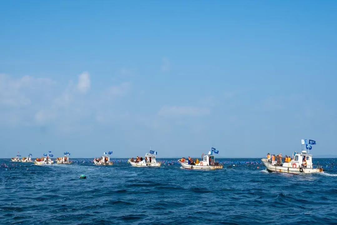 冬捕節(jié)當天,漁民們載歌載舞唱響了冬捕節(jié)主題曲《采參謠》,傳遞著豐收的喜悅。20余名潛水員的鄭重宣誓:“感恩生態(tài),限量采捕”,表達了獐子島人對海洋始終懷有敬畏之心、感恩之情。伴著剛勁渾厚、鏗鏘有力的長海號子,全副武裝的潛水員們分乘30余艘漁船劈波斬浪、乘風出海,直奔當日源刺參采捕地——獐子島馬牙灘海域。