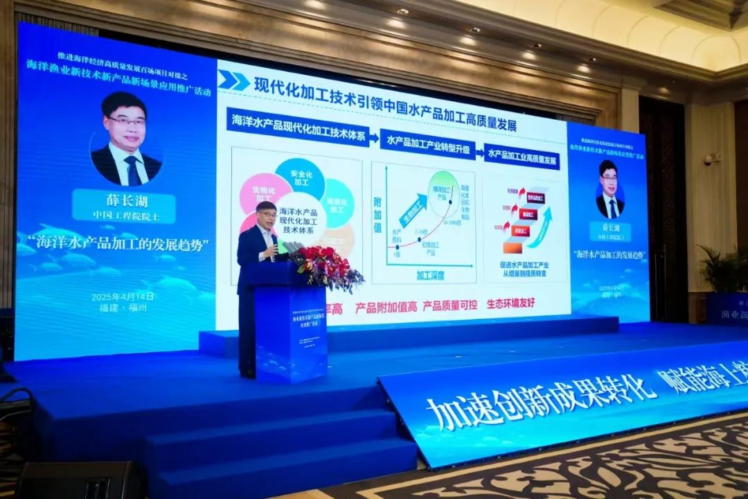 在主旨報(bào)告環(huán)節(jié),劉少軍以《魚類良種良養(yǎng)良銷》為題,聚焦魚類遺傳育種,分享了合方鯽等優(yōu)質(zhì)魚類育種成果,并強(qiáng)調(diào)生態(tài)養(yǎng)殖模式創(chuàng)新,提出通過(guò)“良種+良養(yǎng)+良銷”全鏈條創(chuàng)新提升漁業(yè)競(jìng)爭(zhēng)力。薛長(zhǎng)湖以《海洋水產(chǎn)品加工的發(fā)展趨勢(shì)》為題,分析了海洋食品加工的高值化、綠色化趨勢(shì),指出當(dāng)前水產(chǎn)品加工領(lǐng)域存在的品質(zhì)參差不齊、技術(shù)創(chuàng)新不足等問題,并分享了團(tuán)隊(duì)在生物加工、營(yíng)養(yǎng)功能化加工、冷凍保鮮技術(shù)等方面的創(chuàng)新成果。