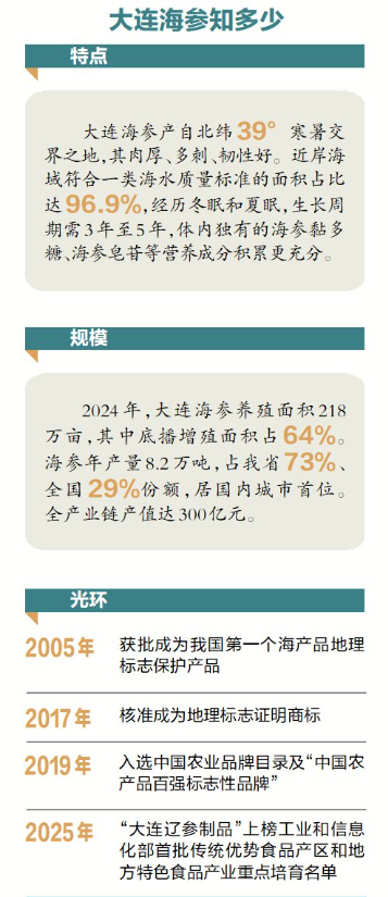 位于遼東半島的大連,是一座盛產海珍品的城市,海參、鮑魚、蝦夷扇貝等全國聞名,其中,海參最具代表性,現(xiàn)已形成海參育苗、養(yǎng)殖、加工、銷售全產業(yè)鏈,產值達300億元,帶動就業(yè)超30萬人。