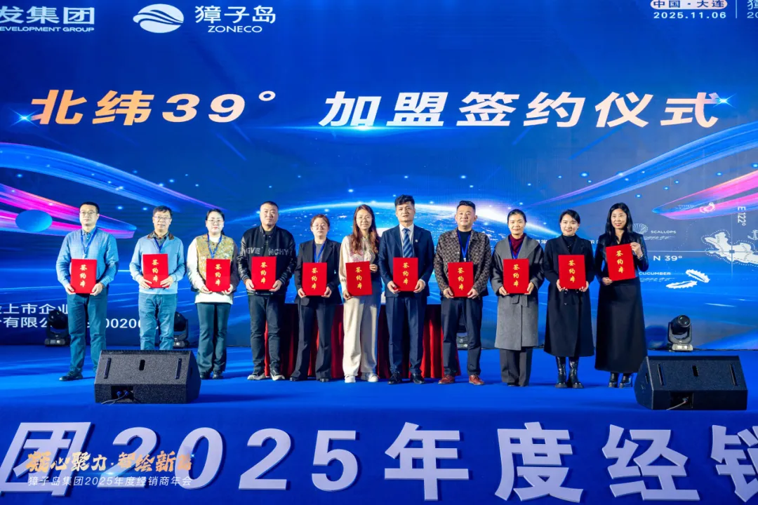 在經(jīng)銷商年會上,獐子島集團隆重進行了北緯39°品牌的啟動亮相儀式。在海發(fā)集團副總經(jīng)理高鵬,獐子島集團總裁路珂、副總裁劉明以及兩位經(jīng)銷商代表的共同推動下,北緯39°品牌正式啟幕,這一時刻標志著獐子島集團在新征程上邁出了堅實且關(guān)鍵的一步,開啟品牌發(fā)展的全新篇章。10位滿懷激情與創(chuàng)造力的新加盟商與獐子島集團成功簽約,成為北緯39°品牌首批經(jīng)銷商。他們的加入,為品牌注入了鮮活的生命力與源源不斷的新鮮血液,有力地拓寬了市場版圖,讓獐子島集團的發(fā)展藍圖愈發(fā)廣闊清晰。