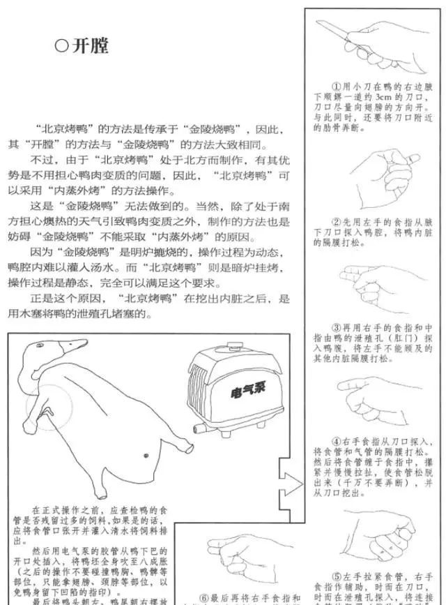 圖里的步驟,只是烤一只鴨子,還沒有到片鴨,按照肥瘦部位,一片片把脆鴨皮、鴨肉、骨架片下來的工序。