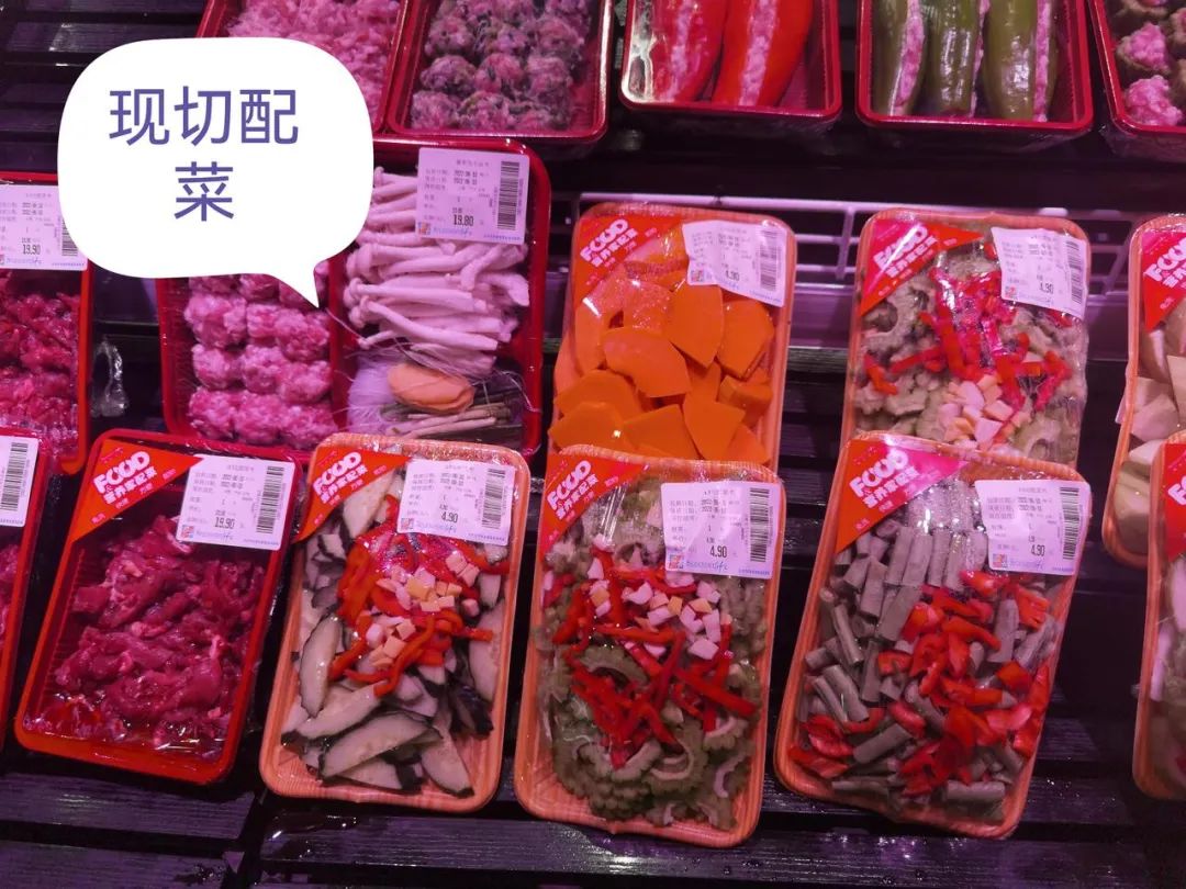 第二類,幫你想好了搭配問題,它叫做鮮切配菜。比如,一份肉丸湯,需要多少冬瓜、肉丸、菌菇,我給你現(xiàn)場配好、切好、處理好,你買回去,就可以直接煮了。