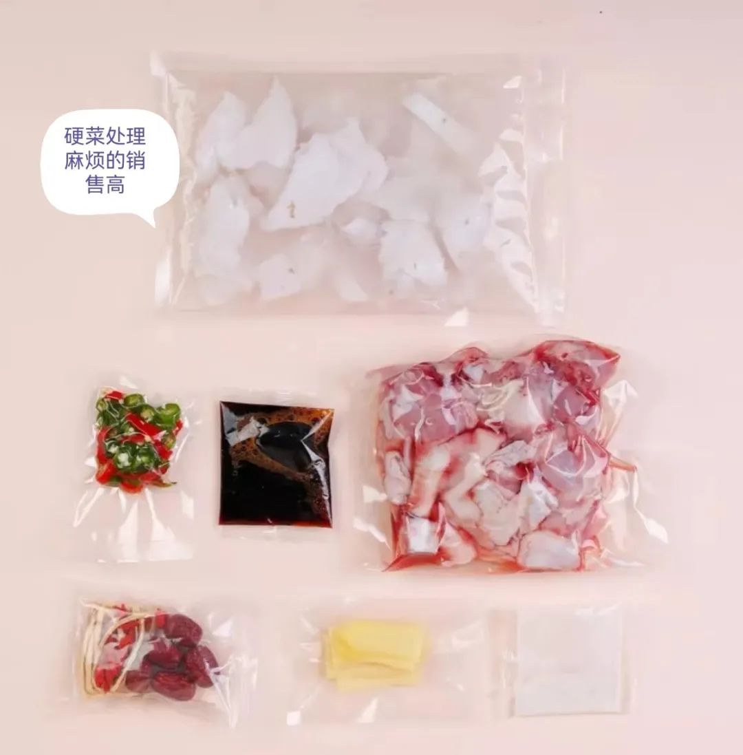 所以就有了第三類,標上步驟,把肉菜、調(diào)料和蔬菜分開打包的類型。