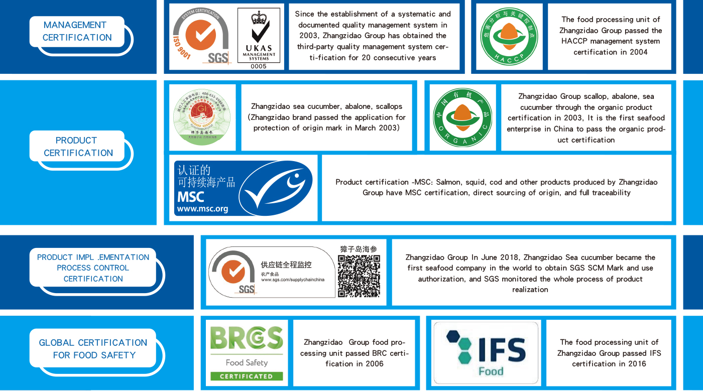 Zhangzi Island is located in the golden sea area of the North Yellow Sea at 39° north latitude, and has been praised as "a red flag in the depths of the Yellow Sea", "Yellow Sea pearl" and "Marine blue chip".  With its unique resource advantages, Zoneco Group Co., LTD. has developed and listed its unique health food, such as sea cucumber, abalone, scallops, salmon, cod, squid, mackerel mackerel, shrimp, leisure food, prepared food, frozen fresh food, cold water live food, which is favored by consumers.  Sales network throughout the country's major cities, and exports to the United States, Canada, Australia, Japan and other more than 20 countries and regions.  "Zoneco" trademark is the first "China Famous trademark" in China's aquatic industry, and Zoneco brand has become "China's most influential aquatic brand" and has been identified as "China's Time-honored Brand".